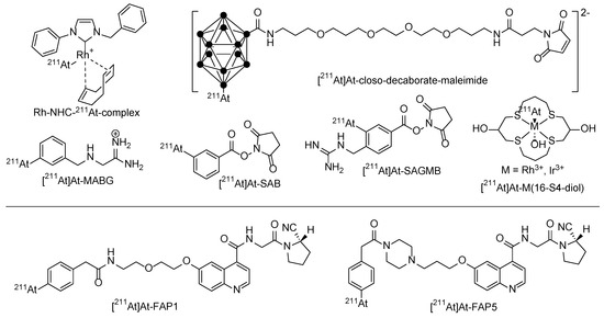 Recently, four new 211At-containing small-molecule radiotherapeutics based on the FAPI binding motif with different linkers (PEG, piperazine) were developed [64]. Cell uptake was performed using FAP-transfected HEK293/FAPα and A549/FAPα cell lines, and biodistribution on PANC-1-cell-bearing mice. Control experiments were performed with 131I-labeled derivatives. [211At]At-FAPI1 and [211At]At-FAPI5 were the most promising with the highest tumor uptake and the best therapeutic effect.