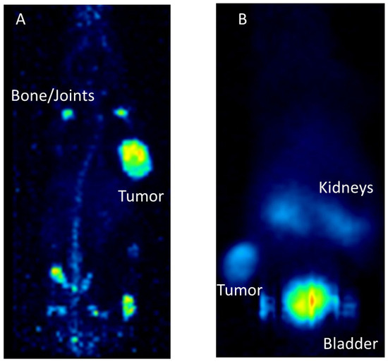 Preclinical examples for targeting with monoclonal antibodies or peptides. (A): [89Zr]Zr–Trastuzumab targeting Her2/neu in a mouse model carrying subcutaneous BT474 tumors. PET imaging was conducted 7 days after radiotracer application. (B): [68Ga]Ga–DOTA–TOC targeting the somatostatin receptor in a mouse model with subcutaneous AR42J tumor. PET imaging was performed one hour after tracer application.