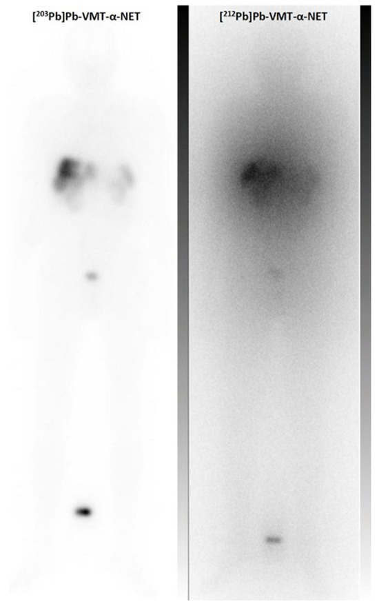 - Muller, D.; Herrmann, H.; Schultz, M.K.; Solbach, C.; Ettrich, T.; Prasad, V. 203Pb-VMT-alpha-NET Scintigraphy of a Patient With Neuroendocrine Tumor. Clin. Nucl. Med. 2023, 48, 54–55. [Google Scholar] [CrossRef] [PubMed]
