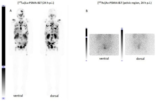 For systemic therapy, typically administered by i.v. route, the properties and availability of the molecular target are undoubtedly dominating factors for successful internal targeted endoradiotherapy. With the prostate-specific membrane antigen (PSMA), a highly expressed carboxypeptidase and a well available target on the cell surface is available and targeted alpha therapy is expected to contribute to further improvements in treating prostate carcinoma. Here, clinical data mainly from 225Ac were reported, but the radionuclide 227Th has also been suggested. 227Th transported by a monoclonal antibody targeting PSMA showed preclinical efficacy in several subcutaneous mouse models and is a candidate for clinical translation [99]. In thirteen patients treated with [225Ac]Ac-PSMA-617, the median overall survival was 8.5 months with a majority of patients showing prostate-specific antigen (PSA) responses [100]. By standardized quality of life questionnaires, a moderate improvement in the global health status was documented. One patient even reported exceeding a 5-year complete remission after [225Ac]Ac–PSMA-617 treatment [101]. In addition to PSMA-617, other PSMA-binding small molecules were also used as binding vectors in clinical application [102]. For example, [225Ac]Ac–PSMA–I&T applied in 1–5 cycles (6–8.5 MBq) was compassionately used in 18 patients, among which seven were experiencing a PSA response with the lowest PSA levels, which were < 50% to baseline. Despite being a well-suited target and although imaging has become increasingly applied in the therapeutic management of PSMA-targeted therapies, the imaging of 225Ac after therapy is—in contrast to the imaging of 177Lu—not well suited for diagnostic purposes. Low therapeutic activities and gamma ray emissions coming from the daughter nuclides preclude the quantification of targeting and post-therapeutic imaging might be mainly suited for quality control (Figure 8). Although the PSA response rates might be high in these patient cohorts, a number of patients did not show a response to PSMA-targeted alpha therapy. A molecular analysis of the non-responding tumor tissue with sufficient PSMA expression from seven patients after therapy with 225Ac-labeled PSMA-617 shows a high rate of alterations in the DNA damage-repair or cell cycle checkpoint [103]. This underlies the importance of the relationship between the tumor biology and targeted alpha therapy.