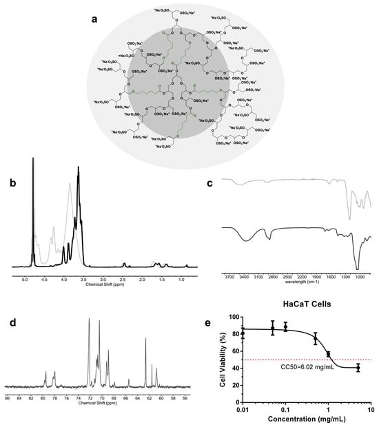 (a) Schematic structure of the dPGS-PCL, (b) 1H NMR of dPGS-PCL (gray) and dPG-PCL (black), (c) IR spectra of dPGS-PCL (black line) and dPG-PCL (gray), (d) 13C NMR inverse-gated in D2O NMR of dPGS-PCL, and (e) cell viability assay of dPGS-PCL for HaCaT cell line, red dot represents the half-maximum cytotoxicity concentration.