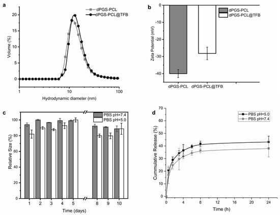 The stability of dPGS-PCL@TFB loaded carriers was tested when kept at room temperature over a period of 10 days. The loaded dPGS-PCL was dissolved in phosphate-buffered saline (PBS) solution at a pH of 7.4 and 5.0 (c = 1 mg/mL). The variation in the hydrodynamic diameter was recorded through dynamic light scattering (DLS) every 24 h.