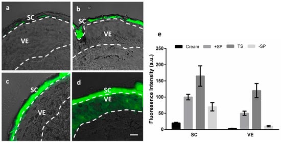 Representative overlay microscopy images (bright field and fluorescence) of human skin after 24 h topical application of (a) sunitinib dissolved in cream (intact skin), and dPGS-PCL@SUN (b) −SP skin model, (c) +SP skin model, and (d) 30 times tape stripped skin model. (e) Fluorescence intensity of sunitinib in different layers of human skin (n = 3, mean ± SD). SC: stratum corneum VE: viable epidermis +/− SP: with/without serine protease treatment, TS: tape-stripped skin. Scale bars correspond to 50 µm.