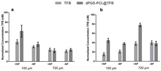 Our study also investigated the penetration of free tofacitinib and dPGS-PCL@TFB in both +SP and −SP human skin models over the time frames of 6 h and 24 h. Using the LC-MS/MS technique, drug penetration was measured quantitatively in different skin layers, at depths of 100 µm and 720 µm. As illustrated in Figure 4a,b, a constant penetration of tofacitinib was observed for both dPGS-PCL@TFB and free TFB in the deeper skin layer (720 µm) after 6 h of incubation. However, after 24 h of incubation (Figure 4b), a high amount of tofacitinib was detected in the deeper layers, especially for +SP skin samples. These results show that the dPGS-PCL dermal drug delivery system is able to penetrate the skin and deliver adequate drug throughout the incubation time of 24 h. However, after this interval, lower amounts of tofacitinib were detected in the skin samples treated with free TFB than in those treated with dPGS-PCL@TFB. In all experiments, at both the 6 h and 24 h time points, no drug was found in the medium beneath the skin or untreated control skin samples.