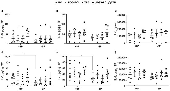 Effects of SP and TFB formulations on inflammatory markers IL-6 (a) and IL-8 (b). Skin samples were incubated for 16 h with (+SP) and without (−SP) topical trypsin (conc. 3 µg/cm2). Then, they were treated with the different TFB formulations for 24 h. Epidermis (a,d) and dermis (b,e) extracts as well as culture media (c,f) were analyzed for the content of the inflammatory cytokines using ELISA. * p < 0.05. No statistically significant differences were calculated between controls and treatments. Each symbol represents the value from each independent experiment. Lines represent the average and standard errors. UC = untreated control.