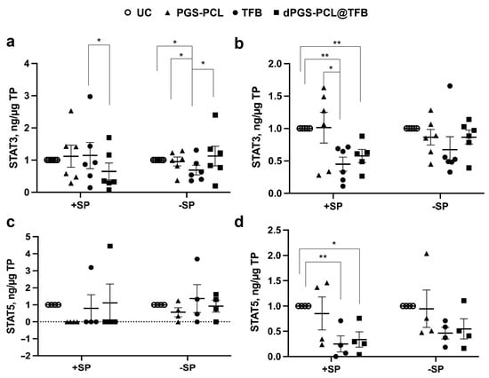 Considering the deeper dermis layers, both the TFB-loaded carrier and free TFB significantly reduced STAT3 activation in SP-treated skin (+SP), while no significant differences could be measured in the skin with an intact barrier (−SP) (Figure 6b). As for STAT 5, a reduction of activity could be measured in almost all samples but only for skin with a disrupted SC (+SP) (Figure 6c). Similar results were found for the dermis of skin pre-treated with SP (Figure 6d). These results show that TFB, being a small drug, can penetrate the skin with a disrupted barrier and inhibit JAK-STAT activity. Nevertheless, a better effect in the epidermis of SP+ samples could be observed for the dPGS-PCL@TFB formulation. This is probably due to a better and faster drug delivery to the skin as seen from the drug release measurements after 6 h of incubation (Figure 4a).