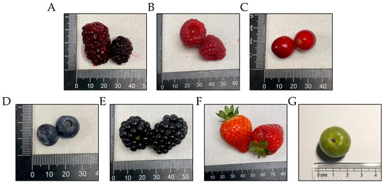 Representative images of (A) black raspberries, (B) raspberries, (C) cranberries, (D) blueberries, (E) blackberries, (F) strawberries, and (G) Indian gooseberry.