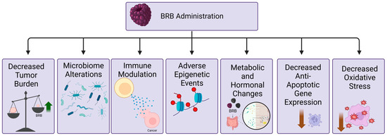 Schematic representation of the effects of BRB administration in cancers of the aerodigestive tract (created with BioRender.com accessed 29 December 2023). BRB-mediated decrease in tumor burden can be attributed to alterations in the microbiome, modulation of the immune response, changes in epigenetic events, metabolic and hormonal pathways, decreased expression of anti-apoptotic genes, and decreased oxidative stress.