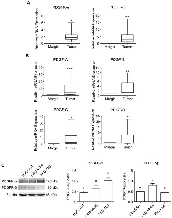 Expression level of PDGF-PDGFR in Thai-CCA tissues and OV-related CCA cell lines. mRNA expression of (A) PDGFR and (B) PDGF ligands in paired CCA and normal margin tissue, determined by RT-qPCR. Results are presented as box-and-whisker plots with a 5–95% confidence interval. Statistical comparisons were conducted using the Wilcoxon matched-pairs test. *, **, and *** indicate significant difference from pair normal margin tissues at p < 0.05, p < 0.01, and 0.001, respectively. (C) Analysis of basal PDGFR-α and PDGFR-β protein expressions in different CCA cell lines by Western blot analysis. The level of protein expression was normalized with the internal control, β-actin. Different letters indicate significant differences among cell lines in each protein marker, p < 0.05.