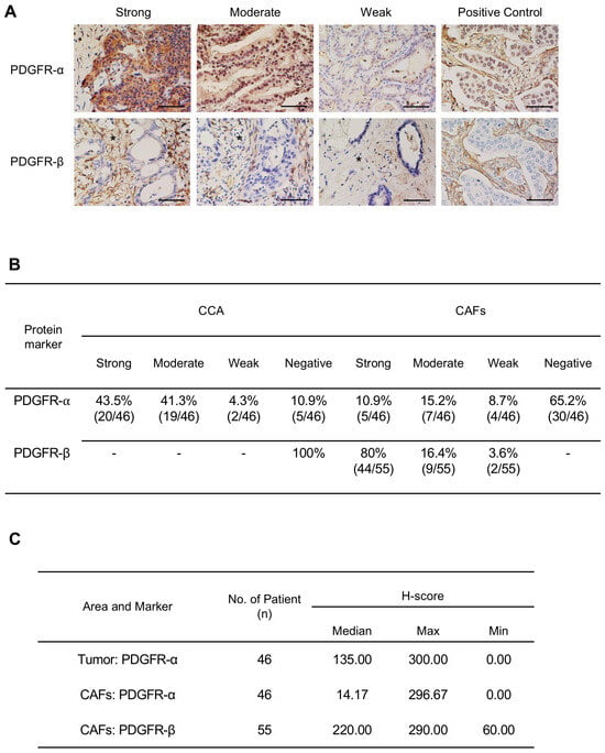 (A) Representative images showing the expression level of PDGFR-α and PDGFR-β in Thai-CCA tissues. The expression intensity was evaluated separately in CCA tumor cells and cancer-associated fibroblasts (CAFs) (3+, strong staining; 2+, moderate staining; and 1+, weak staining). Breast cancer tissues were used as a positive control for PDGFR. Asterisks indicate stromal area. Scale bars = 50 μm. (B) Percentage of CCA tissues expressing PDGFR-α and PDGFR-β in CCA tumors and CAFs. (C) H-score values of PDGFR-α and PDGFR-β expression in tumor and CAF areas.