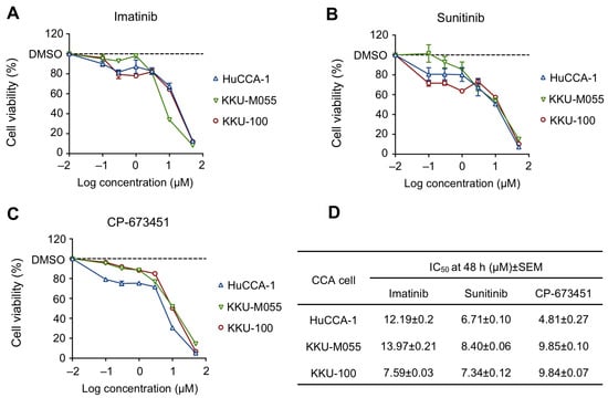 Cell viability of CCA cell lines treated with (A) Imatinib, (B) Sunitinib, and (C) CP-673451 for 48 h at the indicated concentrations, evaluated by MTT assay. (D) IC50 of PDGFR inhibitors in CCA cell lines. Data are shown as a mean ± SEM of triplet individual experiments.