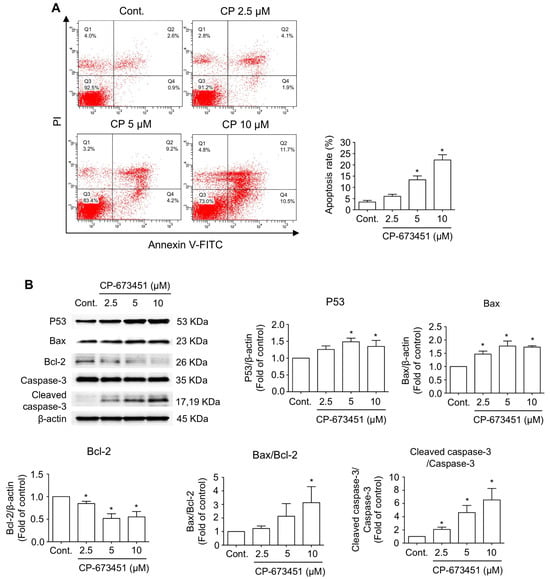 CP-673451-induced CCA cell apoptosis. (A) HuCCA-1 cells were incubated with CP-673451 for 24 h at the indicated concentrations, and apoptosis was examined by flow cytometry using Annexin V-FITC and PI staining. (B) Apoptosis proteins including P53, Bax, Bcl-2, caspase-3, and cleaved caspase-3 were examined in HuCCA-1 cell lysates after CP-673451 treatment for 12 h by Western blotting. Β-actin was used as an internal control. Data are shown as a mean ± SEM of triplet individual experiments. * specifies a significant difference from the control group at p < 0.05.
