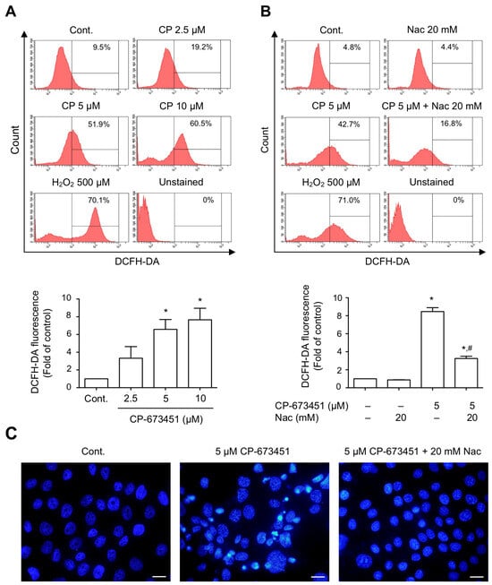 CP-673451-induced ROS elevation in CCA cells. Flow cytometry analysis demonstrating (A) 5 and 10 μM CP-673451 significantly induced increased cellular ROS level, while (B) administration of Nac (20 mM) efficiently reversed the effect of CP-673451 on HuCCA-1 cells. (C) Fluorescent micrographs showing DAPI-stained apoptotic nuclei of CCA cells treated with CP-673451. Treatment of CCA cells with Nac could protect cells from CP-673451-induced apoptosis. Scale bars = 20 μm. Data are shown as a mean ± SEM of triplet individual experiments. * and # indicate significant difference from control and CP-673451 group, respectively, at p < 0.05.