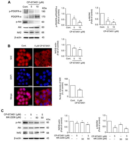 CP-673451 inhibited PDGFR-mediated PI3K/Akt/Nrf2 signaling. (A) Western blot analysis of p-PDGFR-α, PDGFR-α, p-Akt, Akt, and Nrf2 in HuCCA-1 cells treated with CP-673451 for 6 h at the indicated concentrations. (B) Immunofluorescent images showing Nrf2 nuclear translocation (red) in CCA cells. Cell nuclei were stained with DAPI (blue). HuCCA-1 cells were incubated with 5 μM CP-673451 for 3 h, probed with an anti-Nrf2 antibody, and photographed under a fluorescent microscope. Bar graphs represent the averaged nuclear intensity of Nrf2 determined in six random fields. Scale bars = 20 μm. (C) Western blot analysis of p-Akt, Akt, and Nrf2 in HuCCA-1 cells treated with CP-673451 (5 µM), MK-2206 (50 µM), and MK-2206 combined with CP-673451. Β-actin was used as an internal control. Data are shown as a mean ± SEM of triplet individual experiments. * indicates a significant difference from the control group at p < 0.05.