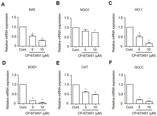 Nrf2 plays a crucial role in controlling the expression of phase II antioxidant enzymes, including NAD(P)H: quinone oxidoreductase 1 (NQO1), Heme oxygenase-1 (HO-1), Superoxide dismutase 1 (SOD1), Catalase (CAT), and Glutamate–Cysteine Ligase Catalytic Subunit (GCLC), each acting in oxidative stress elimination []. To investigate the effect of CP-673451 on Nrf2 activity, we conducted RT-qPCR to examine the expression of these phase II antioxidant genes. The results demonstrated that the exposure of HuCCA-1 cells to CP-673451 for 6 h led to a dose-dependent decrease in the expression of Nrf2 and all the phase II antioxidant enzymes mRNAs (Figure 7).