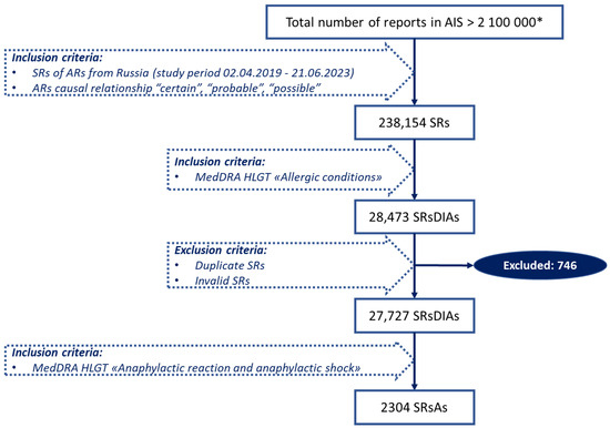 Data selection was made using the steps described in Figure 2. First, from the total number of reports in the AIS “Pharmacovigilance” database, SRs from the Russian Federation only were extracted with the obligative inclusion criterion of a high probability of a causal relationship (“certain”, “probable”, “possible”). Probability assessment was performed automatically in the AIS “Pharmacovigilance” database using the built-in Naranjo algorithm. Second, using the MedDRA high-level group term (HLGT) “Allergic conditions”, we defined the total number of SRs describing drug-induced allergy (SRsDIAs). Then, we excluded duplicate and invalid reports to obtain the exact number of SRsDIAs that occurred in the Russian Federation. Validity was determined according to paragraph VI.B.2 of the EMA “Guideline on good pharmacovigilance practices” and paragraph 407 of the Eurasian Economic Union “Good pharmacovigilance practice”, which state that information in an SR must contain at least 4 elements: identifiable reporter; identifiable patient; at least one suspected drug; an at least one suspected ADR. If any of these 4 elements is absent, the report is considered invalid [84,85]. In the next step, we used the MedDRA HLGT “Anaphylactic reaction and anaphylactic shock” to detect SRs with anaphylaxis (SRsAs).