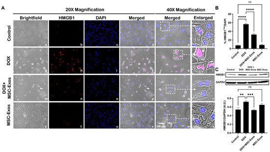 MSC-Exos diminishes pyroptotic initiator HMGB1 in an in vitro DIC model. (A) Representative photomicrographs depict 20× brightfield snapshots (a, g, m, s), HMGB1+ve cells (red; b, h, n, t), DAPI (blue; c, i, o, u), and merged 20× snapshots (d, j, p, v). Brightfield merged snapshots at 40× (e, k, q, w) and white dotted boxes with arrows denote an expanded area of 40× snapshots (f, l, r, x). Scale bar = 100 µm. (B) MSC-Exos reduces the proportion of HMGB1+ve cells induced by DOX. (C) HMGB1 was assessed in cell lysates, followed by densitometric analysis. The error bar denotes SEM. ** p < 0.002, *** p < 0.0006, **** p < 0.0001, ns = non-significant.