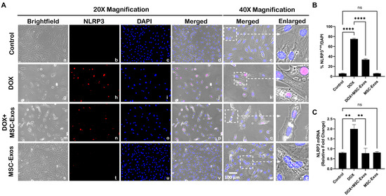MSC-Exos decreases NLRP3 inflammasome formation in an in vitro DIC model. (A) Representative photomicrographs depict 20× brightfield snapshots (a, g, m, s), NLRP3+ve cells (red; b, h, n, t), DAPI (blue; c, i, o, u), and merged 20× snapshots (d, j, p, v). 40× brightfield merged snapshots (e, k, q, w) and white dotted boxes with arrows denote an expanded area of 40× snapshots (f, l, r, x). Scale bar = 100 µm. (B) MSC-Exos reduces the proportion of NLRP3+ve cells induced by DOX. (C) Relative fold change of NLRP3. The error bar denotes SEM. ** p < 0.002, **** p < 0.0001, ns = non-significant.