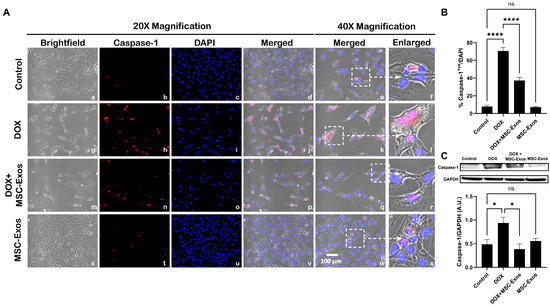 MSC-Exos mitigates pyroptotic cascade marker caspase-1 in an in vitro DIC model. (A) Representative photomicrographs depict 20× brightfield snapshots (a, g, m, s), caspase-1+ve cells (red; b, h, n, t), DAPI (blue; c, i, o, u), and merged 20× snapshots (d, j, p, v). 40× brightfield merged snapshots (e, k, q, w) and white dotted boxes with arrows denote an expanded area of 40× snapshots (f, l, r, x). Scale bar = 100 µm. (B) MSC-Exos reduces the proportion of caspase-1+ve cells induced by DOX. (C) Caspase-1 was assessed in cell lysates, followed by densitometric analysis. The error bar denotes SEM. * p < 0.05, **** p < 0.0001, ns = non-significant.