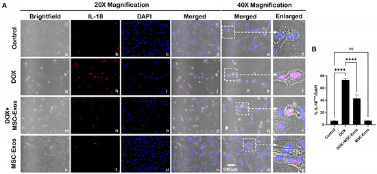 MSC-Exos mitigates pyroptotic cascade marker IL-18 in an in vitro DIC model. (A) Representative photomicrographs depict 20× brightfield snapshots (a, g, m, s), IL-18+ve cells (red; b, h, n, t), DAPI (blue; c, i, o, u), and merged 20× snapshots (d, j, p, v). 40× brightfield merged snapshots (e, k, q, w) and white dotted boxes with arrows denote an expanded area of 40× snapshots (f, l, r, x). Scale bar = 100 µm. (B) MSC-Exos reduces the proportion of IL-18+ve cells induced by DOX. The error bar denotes SEM. **** p < 0.0001, ns = non-significant.