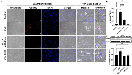 MSC-Exos attenuates pyroptotic executioner GSDMD in an in vitro DIC model. (A) Representative photomicrographs depict 20× brightfield snapshots (a, g, m, s), GSDMD+ve cells (red; b, h, n, t), DAPI (blue; c, i, o, u), and merged 20× snapshots (d, j, p, v). 40× brightfield merged snapshots (e, k, q, w) and white dotted boxes with arrows denote an expanded area of 40× snapshots (f, l, r, x). Scale bar = 100 µm. (B) MSC-Exos reduces the proportion of GSDMD+ve cells induced by DOX. (C) GSDMD was assessed in cell lysates, followed by densitometric analysis. The error bar denotes SEM. * p < 0.05, **** p < 0.0001, ns = non-significant.