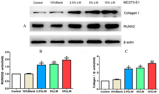2.2.2. Impact of LWDH Pill-Medicated Serum on the Levels of Osteogenic Differentiation-Related Proteins in MC3T3-E1 Cells