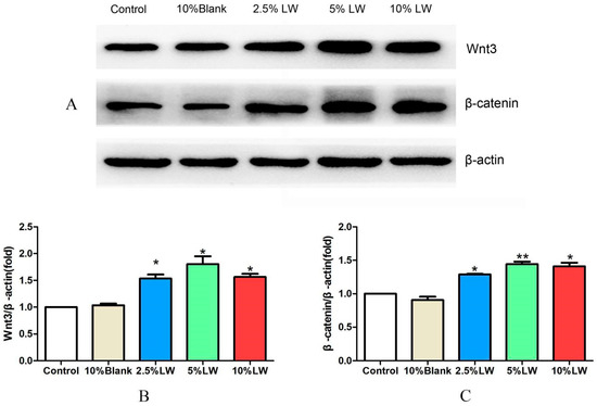 2.2.3. Effect of LWDH Pill-Medicated Serum on the Levels of Wnt/β-catenin Signaling Pathway-Related Proteins in MC3T3-E1 Cells