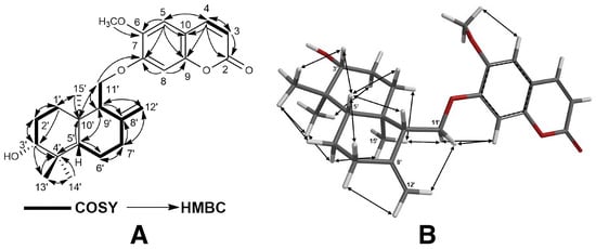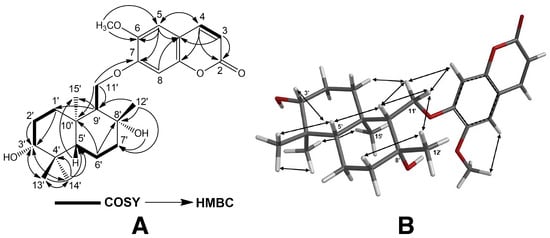 Kayserin B (2) was obtained as a white amorphous compound. The HRESIMS spectrum of compound 2 yielded a [M-H2O + H]+ peak at m/z 413.2311 (C25H33O5+ cal. for 413.2328), suggesting nine degrees of unsaturation for compound 2. Similar to the structural relation observed between kayserin A (1) and colladonin (5), the 1H-NMR and 13C-NMR data of kayserin B (2) (Table 2) display a close resemblance to those of isosamarcandin (8) (Table 2, Supplementary Materials Figures S9, S10, S34 and S35). The presence of a methyl signal due to an aromatic methoxy group at δ 3.87 ppm (s, 3H) along with the partially overlapping of two aromatic proton singlets at δ 3.84 ppm (each 1H, H-5, and H-8) in the 1H-NMR spectrum of kayserin B (2) confirm that the umbelliferon ether part of the isosamarcandin (8) was replaced with scopoletin in compound 2. In addition, the presence of a long-range interaction between one of the H-11′ proton signals and that of the C-7 carbon atom of the scopoletin moiety in the 2D heteronuclear multi-bond connectivity (HMBC) spectrum (Figure 3 and Supplementary Materials Figure S13) corroborates the presence of scopoletin instead of umbelliferone in kayserin B (2). The 2D NOESY correlations observed in compound 2 (Figure 3 and Supplementary Materials Figure S14) also confirms the same relative stereochemistry in the drimane sesquiterpenoid part of compound 2. Thus, the structure of kayserin B (2) should be as shown in Figure 1.