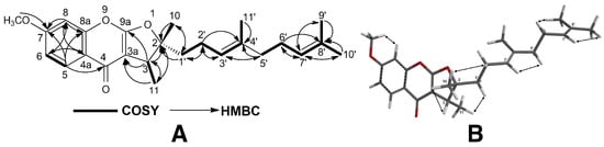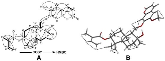 1H-1H-COSY and 1H-13C HMBC (A), and NOESY correlations (B) of 8′-epi-kayserin B angelate (3).