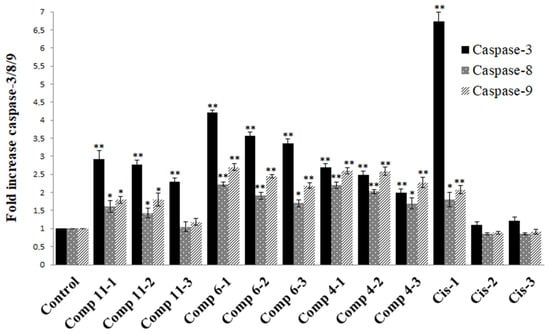 The effects of compounds 4, 6, and 11 and cisplatin on caspase-3/8/9 activities were examined in the COLO 205 cell line. Concerning the results, the caspase-3/8/9 activities of compounds 4 and 6 were higher than those of the negative control in all concentrations. There was an increase in caspase-3 activities for all concentrations of compound 11. However, caspase-8 and -9 activities were increased only at 130 µM and 26 µM concentrations. Furthermore, compound 4, compound 6, and compound 11 showed an increase in caspase-3 activity by 2.7-, 4.2-, and 2.9-fold; in caspase-8 activity by 2.2-, 2.2-, and 1.6-fold; and in caspase-9 activity by 2.6-, 2.7- and 1.8-fold, respectively, when compared with the negative control at the highest concentration (130 µM). Cisplatin (Cis) was a positive control for the caspase activities. It increased the caspase-3/8/9 activities by 6.73-, 1.8-, and 2.07-fold, respectively, compared with the control at the highest concentration (Figure 6).