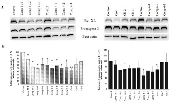 Bcl-xL is an anti-apoptotic protein and plays a role in the regulation of apoptosis by inhibiting the release of cytochrome c from mitochondria. Caspase-3 is an essential executioner for apoptosis processes in the cell due to its effect on disassembling the cells. Western Blot analysis revealed that compounds 4, 6, and 11 suppressed the level of Bcl-xL at all concentrations. The suppression was statistically significant (p < 0.05). Cisplatin (Cis), used as a positive control, showed statistical significance only at the highest concentration (p < 0.005). After treatment with different compounds, the procaspase-3 levels were significantly decreased only at the highest concentration of compound 4 and cisplatin in COLO 205 cells (p < 0.05). The rest of the data were not statistically significant (Figure 7).