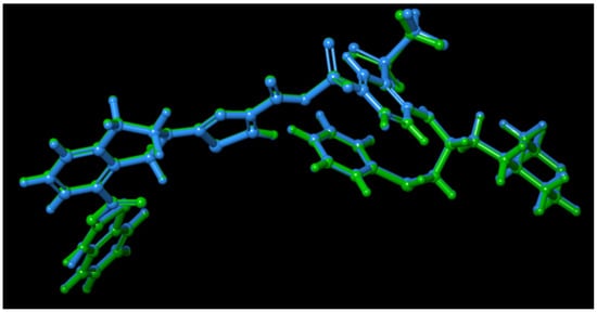 1-Hydroxy-1-(1′-farnesyl)-4,6-dihydroacetophenone (HFDHAP (11)), 7-desmethylferulin D (6), and 3-epi-ferulin D (4), the most active cytotoxic compounds of Ferula caspica (Table 3), were individually docked to the active site of Bcl-xL (PDB ID: 7LH7, 1.40 Å) [36] to examine their probable interactions with the amino acids in the binding site of the Bcl-xL. To verify the reliability of the docking study, the co-crystalized ligand (A1293102) of the Bcl-xL was redocked to the active site of a protein, and the root mean square deviation (RMSD) value was calculated. Depending on the ligand size, an RMSD value below 1.5 or 2 Å in size was regarded to have performed successfully [37]. RMSD was determined to be 0.561 Å, an acceptable value for docking model validation (Figure 8).