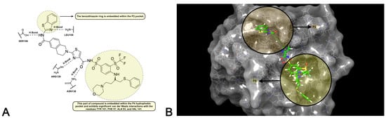 The binding site of Bcl-xL features two key pockets, P2 and P4. Our analysis of the interactions between the co-crystallized ligand A1293102 and the Bcl-xL enzyme’s active site determined that the benzothiazole moiety primarily occupies the P2 pocket. Specifically, the nitrogen atom of the benzothiazole ring engages in a hydrogen bond with LEU108, while the hydrogen atom of the amide group forms a hydrogen bond with SER106. These interactions are critical for the molecule’s binding affinity and selectivity. Additionally, the nitrogen atoms of the central thiazole ring establish a hydrogen bond with ARG139, and the carbonyl oxygen forms a hydrogen bond with ASN136. The remaining portion of the molecule effectively fills the P4 hydrophobic pocket, interacting with ALA93, PHE97, TYR101, and VAL141 through Van der Waals forces (Figure 10) [36]. Our docking studies corroborate these findings, reinforcing the literature’s evidence that A1293102 consistently forms these interactions within the P2 and P4 binding regions of the Bcl-xL enzyme. (Figure 10).