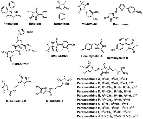 Chemical structures of some biologically active compounds and natural products containing a hydantoin moiety.