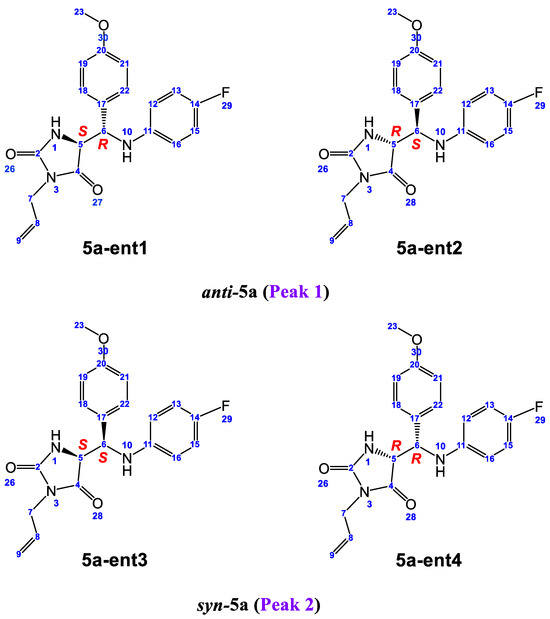 A comparison of chemical shifts, NOE interactions, and coupling constants was performed to obtain more information about the conformation of the two diastereoisomers. Structures, stereochemistry, and numbering for the first eluted (Peak 1) and the second eluted (Peak 2) diastereomer are shown in Figure 2. A comparison of the chemical proton shifts (Table S1) revealed the largest difference in the allylic protons CH2-7, H-8 and CH2-9, which does not reflect differences in the stereochemistry of the two isomers, but is most likely a consequence of the different positioning of the allylic moiety, possibly due to a different conformation of the hydantoin ring in the two diastereoisomers. A comparison of the carbon chemical shifts (Table S2) revealed the largest difference in the chemical shifts of C-6 and C-17, which is a direct consequence of the different stereochemistry at position C-6. A comparison of the NOE interactions (Table S3) revealed only one significant difference. Two weak interactions exist in the first eluted diastereoisomer (Peak 1), H-5/H12,16 and H-5/H18,22, indicating that in this molecule both aromatic rings are positioned equally close to the hydantoin ring proton H-5. In the second eluted diastereoisomer (Peak 2), however, there is only one medium interaction H-5/H18,22 which means that in this molecule the conformation is different and the methoxybenzene is close to H-5, but the fluorobenzene is not. A comparison of the coupling constants (Table S4) showed the largest difference in 3JH-6,NH-10, which was 6.4 Hz for Peak 1 (anti-5a) and 10.6 Hz for Peak 2 (syn-5a). This suggests that the angle between H-9 and NH-10 has changed with different stereochemistry. Although it was not possible to unambiguously determine the stereochemistry of 5a using NMR data alone, the combination with molecular modelling proved to be successful.