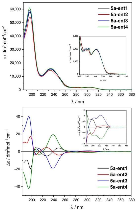 The racemic syn- and anti-allyl hydantoins, syn-5a and anti-5a, were selected for this study and purified to enantiomeric purity (e.e. > 99%) by preparative HPLC on a chiral semi-preparative CHIRAL ART Amylose-SA column using n-hexane/2-PrOH (90/10, v/v) as the mobile phase. Electronic circular dichroism (ECD) and vibrational circular dichroism (VCD) spectra of the enantiomers 5a-ent1, 5a-ent2 (anti-5a, Peak 1), 5a-ent3, and 5a-ent4 (syn-5a, Peak 2) were recorded in acetonitrile and calculated by density functional theory (DFT). Figure 3 reports the UV and ECD spectra of the four isomers of 5a. As expected, the UV spectra are all very similar, while the ECD spectra appear paired in mirror-image couples for the two enantiomers of each diastereomer of 5a. It was anticipated that ECD is dominated by the reciprocal arrangement between the two aromatic chromophores, and therefore, could be especially sensitive to the configuration at C-6; however, major differences also emerge between the diastereomeric pairs, related to the configuration at C-5.