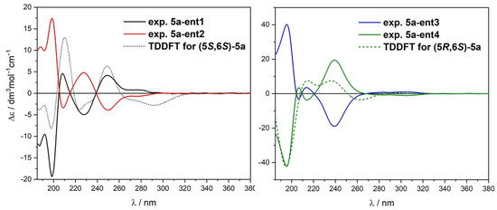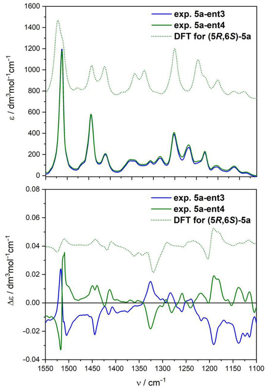 Finally, following the advice to use multiple chiroptical techniques to avoid potentially incorrect assignments [70,71], we extended our study to vibrational CD (VCD). The VCD spectra measurements for 5a-ent3 and 5a-ent4 were especially good in terms of signal-to-noise ratio thanks to the availability of a larger amount of enantiopure samples and looked like mirror images throughout the fingerprint region (Figure 5). DFT calculations run at B3LYP-D3BJ/6-311+G(d,p)/PCM level on (5R,6S)-5a reproduced satisfactorily the experimental VCD spectrum for 5a-ent4, thus confirming the assignment obtained by ECD (Figure 5; similarity factors are provided in the Supporting Information, Table S7). In conclusion, the chiroptical analysis afforded the following assignments: (5S,6S)-5a-ent1, (5R,6R)-5a-ent2, (5S,6R)-5a-ent3, and (5R,6S)-5a ent4.