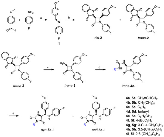 The synthesis of the new 3,5-disubstituted hydantoins 5a–i was carried out as shown in Scheme 1. This study demonstrates the in situ cyclization of racemic trans-β-lactam ureas 4a–i under basic conditions by intramolecular amidolysis leading to the formation of a five-membered hydantoin ring. In the first step, imine 1 was prepared by a condensation reaction between 4-methoxybenzaldehyde and 4-fluoroaniline in an anhydrous dichloromethane medium, using powdered molecular sieves 4 Å (Scheme 1) [57]. The isolated imine 1 was obtained in a yield of 73% after recrystallization from a mixture of ethyl acetate and n-hexane.