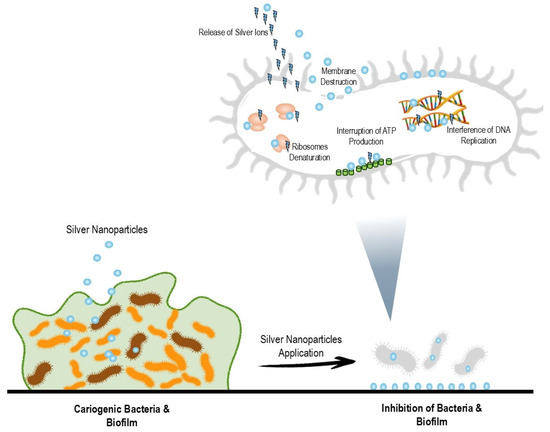 Researchers have applied silver nanoparticles to teeth to prevent dental caries because silver nanoparticles inhibit bacterial growth and biofilm formation (Figure 1). Moreover, silver nanoparticles can infiltrate and lodge into dentinal tubules without aggregation on the dentine surface [63]. They can remain in the dentine structure as a stable and continuous source of silver ions to prevent bacterial invasion. The depth of silver nanoparticles’ infiltration increases with longer exposure times and smaller nanoparticle size. This mechanism explains the long-term anti-caries effectiveness of silver nanoparticles reported in clinical trials [40].