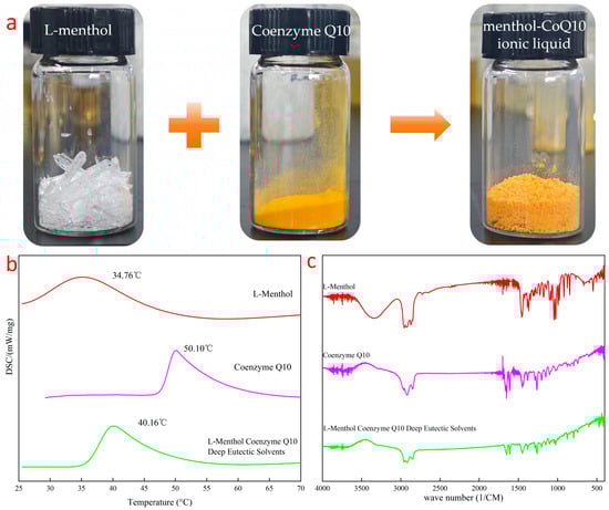 Image of Methol-CoQ10 ionic liquid (a), DSC curve (b), and FTIR spectrum (c) of the ionic liquid Menthol-CoQ10.