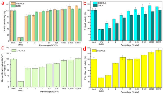 Cell viability refers to the survival of cells after drug application, and the ratio of viable cells is used to evaluate the safety and efficacy of a drug or composition and to aid in development and evaluation to determine the accuracy and efficacy of subsequent efficacy evaluations []. Both GSO-ILE and grapeseed oil exhibited high safety profiles against human melanoma cells (A-375), with cell viability above 90% at a concentration of 1% (Figure 6a). GSO-ILE showed a cell survival rate of 0.5% for mouse melanoma cells (B16) at a concentration of more than 90%, whereas the corresponding concentration of grapeseed oil with cell viability of more than 90% was only 0.062% (Figure 6b). At the same concentration, the grapeseed oil microemulsion had a greater effect on cell survival than the grapeseed oil alone, indicating that the grapeseed oil microemulsion had better cytocompatibility and lower cytotoxicity. GSO-ILE had good cell survival for keratinocytes and fibroblasts (Figure 6c,d) and good cell compatibility at high concentrations (0.25–2%). Subsequent cell efficacy verification tests could be carried out at high concentrations.