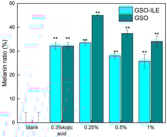 Inhibition of melanin production by GSO-ILE in melanoma cells (B16). Statistical analysis was performed using the t-test. Compared to the blank group, p-value < 0.01 is expressed as “**”.