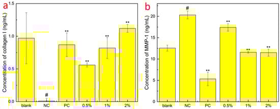 Type I collagen content was detected and analyzed according to the instructions of the MMP-1 mouse matrix metalloproteinase-1 assay ELISA kit. Specifically, 100 μL of detection sample was added; 100 μL of detection solution A was added after incubation at 37 °C for 1 h and 100 μL of detection solution A was added and the plate was washed 3 times after incubation at 37 °C for 1 h, 100 μL of detection solution B was added, and 100 μL of 37 °C was incubated for 0.5 h. The plate was washed five times before 90 μL of TMB substrate and 50 μL of stop solution were added, absorbance value data at 450 nm were read immediately, and three repeat wells were set at each concentration.