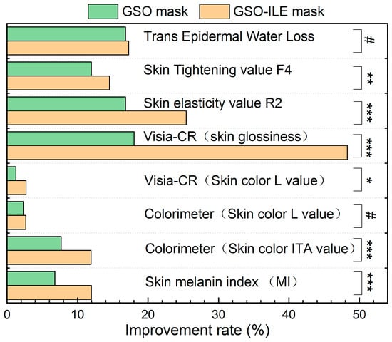 Clinical trials of GSO-ILE masks and grapeseed oil masks improved outcomes after 28 days of use. All statistics were expressed as mean ± SD (n = 30). Statistical analysis was performed using the t-test. “#” means no statistical difference, p value is greater than or equal to 0.05, p value less than 0.05 means significant difference (“*” means 0.01 ≤ p < 0.05, “**” means 0.001 ≤ p < 0.01, “***” means p < 0.001).