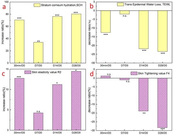 Results of clinical trials using the GSO-ILE mask at different times: cuticle water content (a), percutaneous water loss (b), elasticity R2 (c), and compactness F4 (d). All statistical data are represented as mean ± SD (n = 30). Statistical analysis was performed using the t-test. “n.s.” means no statistical difference, p value is greater than or equal to 0.05, p value less than 0.05 means significant difference (“*” means 0.01 ≤ p < 0.05, “**” means 0.001 ≤ p < 0.01, “***” means p < 0.001).