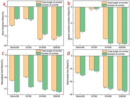 Clinical trial results of facial wrinkles at different times: eye (a), tail (b), decree (c), puppet (d). All statistical data are represented as mean ± SD (n = 30). Statistical analysis was performed using the t-test. “n.s.” means no statistical difference, p value is greater than or equal to 0.05, p value less than 0.05 means significant difference (“*” means 0.01 ≤ p < 0.05, “**” means 0.001 ≤ p < 0.01, “***” means p < 0.001).