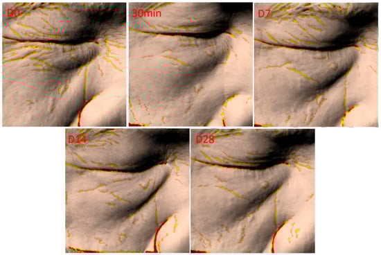 After using the GSO-ILE mask, the total length of wrinkles under the eyes, eye-tail lines, nasolabial folds, and marionette lines (Figure 11a–d) within 30 min decreased by 9.5, 9.7, 11.2, and 9.7%, respectively, and the total number decreased by 6.2, 7.6, 16.2, and 14.8%, respectively, indicating that the GSO-ILE mask had a significant short-term anti-wrinkle effect on the length and number of wrinkles in various parts of the face. After using the grapeseed oil microemulsion mask for 28 days, the total length of various wrinkles decreased by 16.5, 11.2, 15.6, and 26.0%, and the total number of various wrinkles decreased by 14.9, 11.4, 16.2, and 27.0%, respectively, indicating that the GSO-ILE mask has a significant long-term anti-wrinkle effect on the length and number of wrinkles in various parts of the face. Figure 12 shows the changes in facial wrinkles after a volunteer used the GSO-ILE mask for 28 days. It can be seen that the yellow mark is used on the furrow part of the picture, and the number of yellow furrow stripes decreases and narrows with the increase of the number of uses, indicating that the number and volume of wrinkles can be significantly reduced with the use of GSO-ILE mask for a long time. Overall, clinical verification of human efficacy proved that the GSO-ILE mask has good moisturizing, firming, repairing, and antiwrinkle effects. Although there was no significant improvement in eye wrinkles in the short term (<7 days), the GSO-ILE mask could significantly improve the stratum corneum hydration, transepidermal water loss, skin elasticity, and firmness, and it had a positive effect on under-eye wrinkles, eye tail lines, nasolabial folds, and marionette lines.