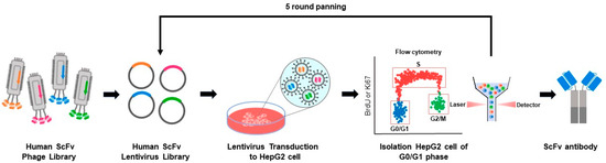 We developed a novel antibody screening method to select antibodies that induce tumor growth inhibition (Figure 1). It uses a human single-chain fragment variable (ScFv) phage library to construct a human ScFv lentiviral intracellular combinatorial antibody library containing 108 unique binding clones. The antibodies were displayed on the cell surface using our previously published methods [6,7,8,9,10]. We first infected HepG2 liver cancer cells with the ScFv lentiviral library in vitro. After three days of culture, the cells were selected by flow cytometry. In the first round, cells were sorted by selecting the Ki67-negative population. Afterward, genomic DNA was extracted from these cells, amplified, and used to clone a targeted lentiviral library for the next round of experiments. In the subsequent 2–5 rounds, cells were sorted based on the BrdU-negative population, which indicates the G0/G1 phase of the cell cycle. Each round of cell panning produced a more focused antibody library that is specific to the G0/G1 phase in the HepG2 cell line compared to earlier rounds. With each round, there was an increased population of cells in the G0/G1 phase compared to the control (Figure S1). These results confirm that our new screening method is effective in finding antibodies that induce specific cell cycle phases in cancer cells. To determine if a single antibody from the sorted cell population could suppress cell growth, the sorted cells were collected, and the integrated antibody gene was recovered by PCR. The H9 gene sequence was consistently observed in cells in the G0/G1 phase, leading to the selection of this antibody for further investigation.
