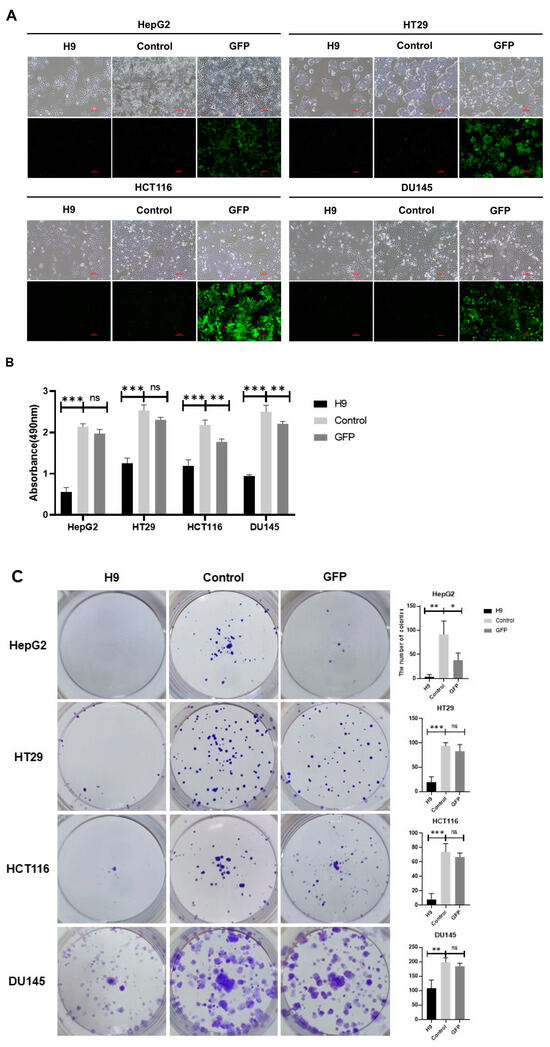 Cells were seeded at a clonogenic density of 200 to 500 cells per well in 12-well plates. After 24 h, they were treated with the H9 lentivirus and a 10 µg/mL polybrene transfection reagent (Merck Millipore, Darmstadt, Germany) for 12 h. During this treatment period, the medium was changed twice, with a fresh medium added every 3 days. After 10 to 12 days, colonies were fixed with a concentration of 4% paraformaldehyde in PBS for 20 min, washed with PBS, and then stained with a concentration of 0.03% crystal violet in water for 20 min. All experiments were performed in triplicate.