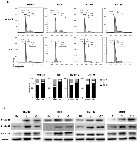 Because the H9 antibody was derived from a specific G0/G1 phase population in the cell cycle, we next investigated whether H9 specifically leads to the phase of cell cycle arrest. To assess whether H9 regulates cancer cell growth, we used flow cytometry to observe propidium iodide (PI) staining on HepG2, HT29, HCT116, and DU145 cell lines following treatment with H9. After H9 treatment for two days, the proportion of H9-treated tumor cells in the S, G2, and M phases was reduced compared to the controls. Specifically, the percentage of cells in the sub G2/M phase in HepG2, HT29, HCT116, and DU145 cell lines decreased by 6.2%, 28%, 8.8%, and 2.7%, respectively (Figure 3A). Concurrently, the percentage of cells in the sub G0/G1 phase increased by 12.1%, 30.2%, 13.8%, and 8.1%, respectively. Overall, our analysis highlighted a significant reduction in the G2/M peak and an increase in the G0/G1 peak compared to the control (Figure 3A). Cyclin D1 is crucial for regulating the transition from the G1 phase to the S phase in eukaryotic cells, with low protein levels during the G0 phase. Cyclin E1 is also essential for the G1/S transition, and its protein levels increase during the late G1 and S phases. Cyclin B1 reaches high levels during the G2/M phase. To further explore these key protein levels, HepG2, HT29, HCT116, and DU145 cells were treated with H9, and their cell lysates were evaluated using Western blotting with antibodies against cyclin B1, cyclin D1, and cyclin E1. The results confirmed that a significant downregulation of cyclin B1, cyclin D1, and cyclin E1 in four tumor cell lines were stimulated with H9. These results were consistent with the level of cyclins during cell cycle arrest (Figure 3B). Thus, these findings confirmed that H9 induces G0/G1 cell cycle arrest in HepG2, HT29, HCT116, and DU145 cells.